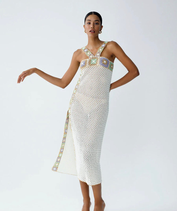 This hand-crocheted maxi dress is a fresh take on stylish, festival trend. With its straps, bust and down the sides, the shape is elongating and flattering and boho chic in the most elegant way.